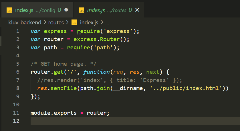 5. backend/routes/index.js파일에 path 모듈을 추가하고 res.sendfile을 아래와같이 추가한다. (res.render는 주석처리한다.)